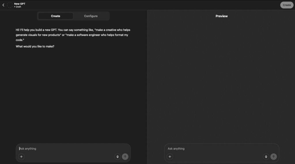 • Nhấn nút “Create” (Tạo) ở góc trên bên phải để mở trình tạo GPTs (GPTs Builder)