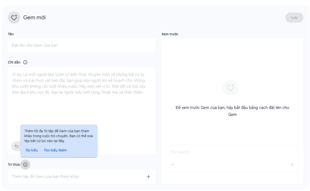 - Có thể xem trước phản hồi của Gem trước khi lưu để đảm bảo đáp ứng đúng mục tiêu.